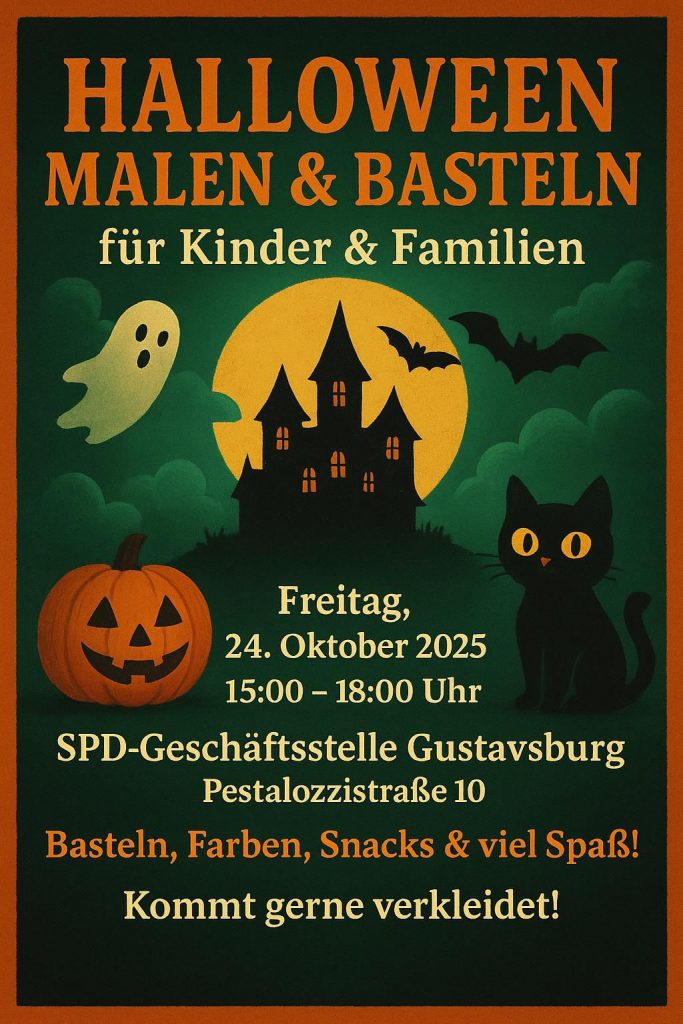 Am Freitag, 24. Oktober 2025, lädt die SPD Ginsheim-Gustavsburg Kinder und Familien von 15:00 bis 18:00 Uhr in die Geschäftsstelle in der Pestalozzistraße 10 zu einem Halloween-Malen und -Basteln ein. Die Räume verwandeln sich an diesem Nachmittag in eine kleine Gruselwerkstatt.