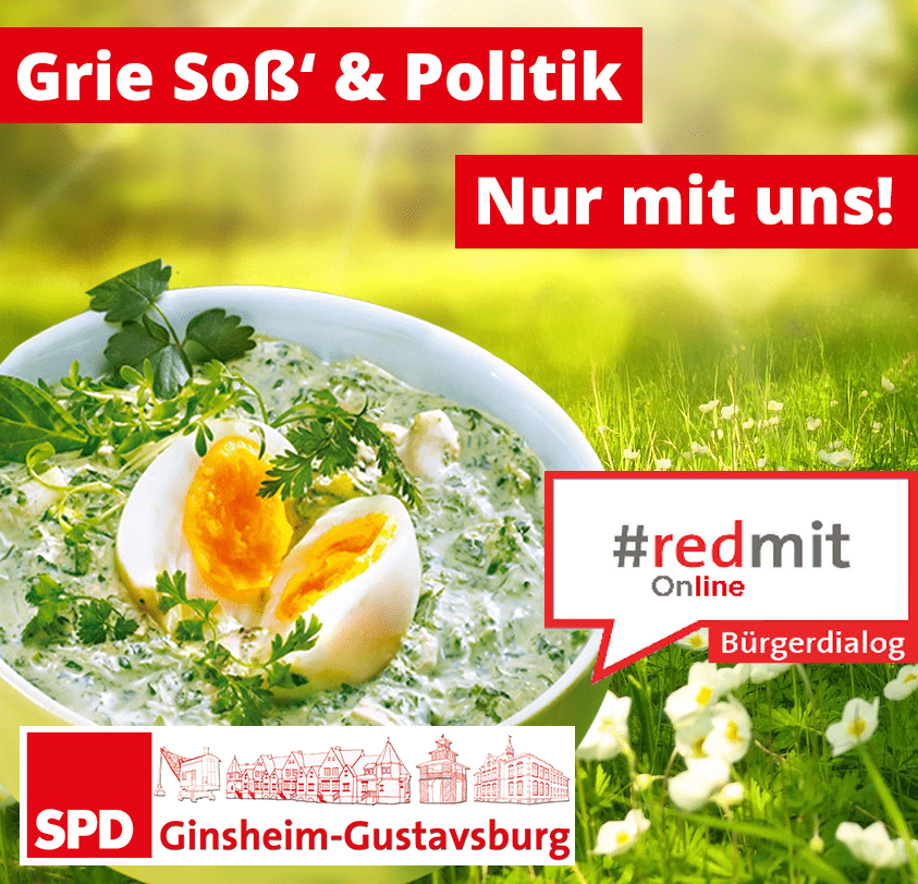 Unter der Überschrift „#redmit Digital – Die SPD isst Grie Soß‘“ lädt der SPD Ortsverein Ginsheim-Gustavsburg am Freitag, den 16. April 2021, ab 18 Uhr, die Bürgerinnen und Bürger der Stadt wieder zum kommunalpolitischen Austausch in der Sitzungsrunde der Stadtverordnetenversammlung ein. Bedingt durch die Pandemie findet dieser wieder in digitaler Form statt.